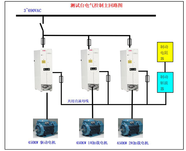 車輛動力總成測試臺架在滿足工藝要求的前提下,盡可能的采用既可靠又經濟的電氣傳動方案。本系統采用變頻共用直流母線式制動(直流母線連接+斬波制動電阻單元)控制方案。本方案選用高性能的ABB-ACS800變頻器、ABB電機、ABB制動單元和制動電阻組成高性價比的傳動系統。請參閱《測試臺電氣控制主回路圖》