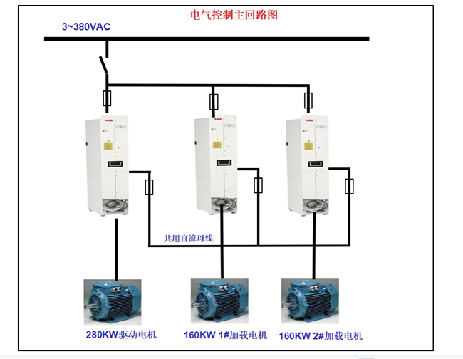一臺變頻器(驅動變頻器)控制驅動電機運行轉動,通過聯軸器(減速機)帶動加載電機轉動。通過另臺變頻器(加載變頻器)的控制,使加載電機處于力矩加載發電狀態,其發出的電能經加載ABB變頻器的IGBT整流單元,輸出直流電,直接與驅動變頻器的直流母線連接,經逆變后轉換成三相交流電供給驅動電機。使整個系統的電能形成一個內部交流循環,從而達到節能目的。